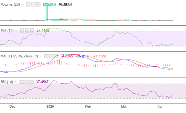 The indicators for this index align with its first recovery phase. The RSI rose upward to indicate a gradual increase in momentum from an oversold region. Following this, MACD lost its bearish strength, signaling the strength of the relatively low bullish volume.