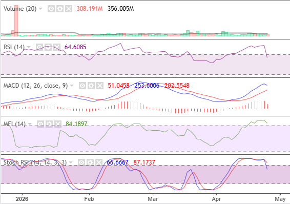 The NGXCSMG remained strong amid profit-taking. MFI remained above its 50-point benchmark at 84.19. RSI declined into its neutral zone, indicating a moderate bullish sentiment. Stochastic signaled profit-taking, while MACD remained bullish with a declining momentum.
