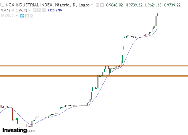 While other sectoral indices declined, the industrial sector gained 0.85%. The index closed at 9,739.32, recording a new all-time high. This performance strengthened the index’s markup phase, following a brief accumulation. Companies that contributed in this index’s performance include DANGCEMENT (+2.24%), BUACEMENT (+2.09%), and WAPCO (+0.71%)
