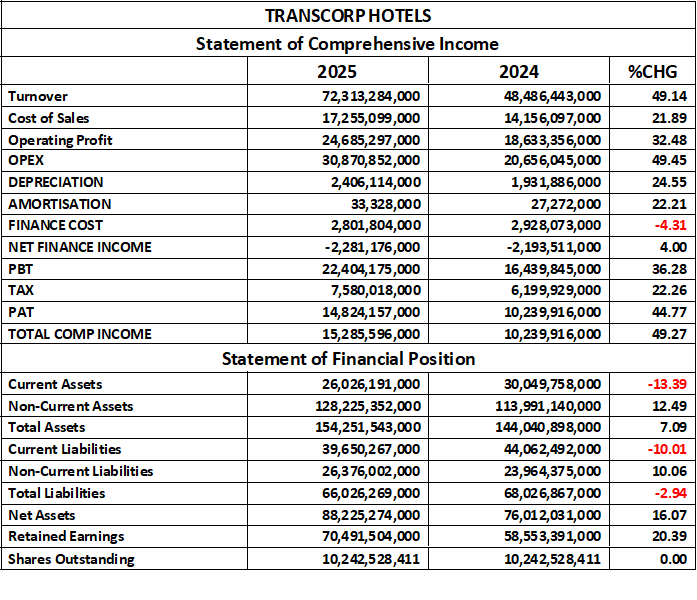 At the end of the first three quarters of 2025, the management of Transcorp Hotels reported a growth in Turnover Value to the tune of N72.313 billion from N48.486 billion in the corresponding period of last year. Cost of Sales equally increased by 21.89% to N17.255 billion from N14.156 billion. Operating Profit is now estimated at N24.685 billion compared to N18.633 billion in the similar period of 2024. In the same trend, Operating Expenses grew by 49.45% to stand at N30.870 billion against N20.656 billion. Finance Cost fell by 4.31% to N2.801 billion. Profit before Tax is currently estimated at N22.404 billion, versus N16.439 billion in the comparable period. Thus, after considering tax expenses, the Net Profit for the year stood at N14.824 billion, higher than the N10.239 billion reported for first nine months of 2024.