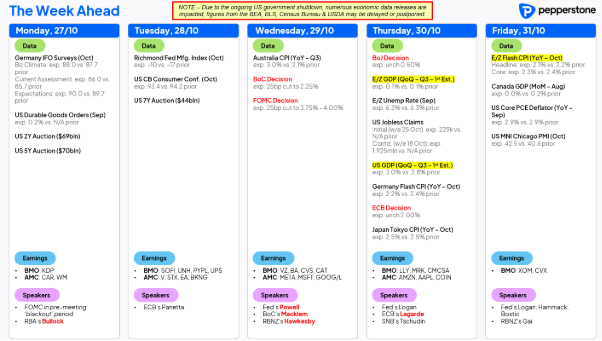 The data docket is also a busy one, although US releases remain affected by the ongoing government shutdown, so Q3 GDP and PCE are almost certainly off the cards. Participants will, though, pay close attention to the latest GDP and CPI prints out of the eurozone, with US consumer confidence and Japan’s Tokyo CPI metrics also worth watching.