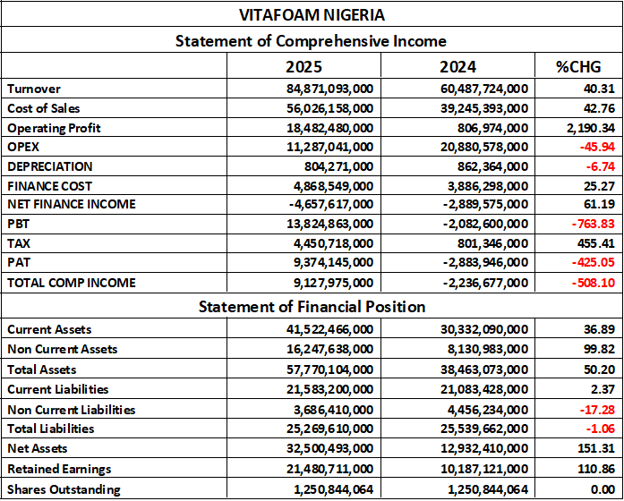 EBITDA Margin galloped to 21.78% from 1.33%, showing a strong recovery in operating efficiency. Vitafoam Nigeria is now generating N0.22 of operating profit from every N1 of sale, compared to only N0.01 generated in the same period of 2024. This indicates better cost control, higher sales efficiency, or improved pricing strategy, a sign of Operational Turnaround and enhanced profitability from core business activities.