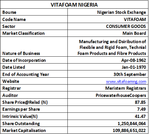 Vitafoam Nigeria Plc is a Nigeria-based manufacturer of flexible, reconstituted, and rigid foam products. It has two segments – Foam products and Furniture/other products. The foam products comprise flexible and rigid foam based products as well as memory foams. The Furniture and other products include wood and metal based furniture and fibers among others. Its products include Inner Core Spring Mattresses, Regular Flexible Foams, Fiber-Based and Allied Products, Rigid Foam, Visco-elastic (Memory) Foam, and Furniture Products.