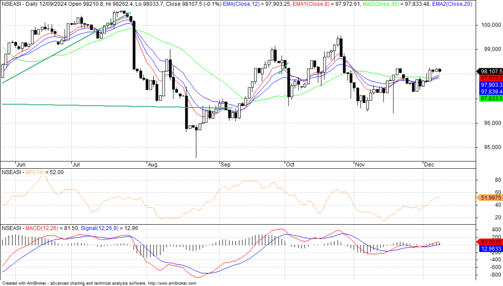 Money flow and other momentum tools were mixed, presenting buy opportunities for bargain hunters who understand the importance of buying low and selling high in any market condition in the midst ongoing volatility. Despite, the selling sentiment in the midst of expected retracement from support level of 98,022.49 basis points and 98,033.94ps to rebound, thereby creating the perfect setup for high probability of reversal or continuation to catch end of year repositioning at the right price. Also, as the index still trade above the T-line and the two moving averages of 50-EMA and 50-SMA, this indicates relatively strength in the midst of changing market fundamentals and technicals on the NGX and the economy.