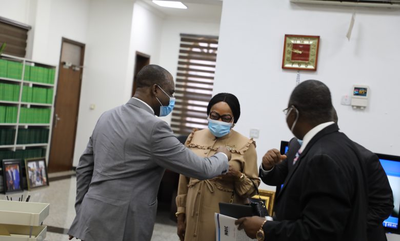 Photo caption: Chief Judge of the Federal High Court, Justice John Tsoho, welcoming the Executive Director (Corporate Services), NDIC, Mrs. Omolola Abiola-Edewor; to the opening ceremony of the 2020 NDIC Sensitization Seminar for Judges of the Federal High Courts in Abuja on Friday, December 18, 2020.