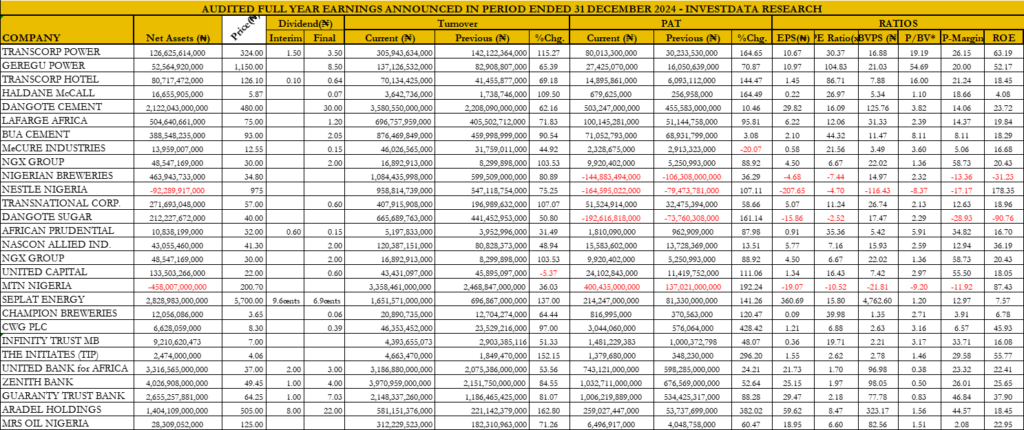 Company News Year-Ended December 2024 Audited Results Announced On Nigerian Exchange So Far Editor March 29, 2025 1 min read 186 Post Views: 78 Continue Reading Previous: Zenith Bank GMD Links Robust N1.03tr 2024 Net Profit To Innovation, Customer-Centric FocusNext: Power Of Earnings Amidst Sector Rotation, Portfolio Reshuffling Trending Now NGX Stretches Winning Streak To Seven Sessions As Broad Buying Keeps Bulls In Control 1 NGX Stretches Winning Streak To Seven Sessions As Broad Buying Keeps Bulls In Control December 19, 2025 Otedola Raises First HoldCo Plc Stake To 17.04% In Latest Deals 2 Otedola Raises First HoldCo Plc Stake To 17.04% In Latest Deals December 19, 2025 Shantali Replaces Jalo-Waziri As CEO Of CSCS Plc After 8 Years 3 Shantali Replaces Jalo-Waziri As CEO Of CSCS Plc After 8 Years December 19, 2025 Oil Prices Edge Up on Russia Sanctions Risk and Venezuela Supply Concerns 4 Oil Prices Edge Up on Russia Sanctions Risk and Venezuela Supply Concerns December 19, 2025 Presco Plc Acquires 10,000-Hectare Plantations In Cross River 5 Presco Plc Acquires 10,000-Hectare Plantations In Cross River December 18, 2025 NGX Maintains Uptrend As Investors Accumulate Blue Chips Despite Slower Trading Activity 6 NGX Maintains Uptrend As Investors Accumulate Blue Chips Despite Slower Trading Activity December 18, 2025 Related Stories Otedola Raises First HoldCo Plc Stake To 17.04% In Latest Deals 1 min read Company News Otedola Raises First HoldCo Plc Stake To 17.04% In Latest Deals December 19, 2025 148 Shantali Replaces Jalo-Waziri As CEO Of CSCS Plc After 8 Years 3 min read Company News Shantali Replaces Jalo-Waziri As CEO Of CSCS Plc After 8 Years December 19, 2025 78 Presco Plc Acquires 10,000-Hectare Plantations In Cross River 2 min read Company News Presco Plc Acquires 10,000-Hectare Plantations In Cross River December 18, 2025 64 BUA Group Doles Out ₦30bn Cash Awards To 510 Employees 3 min read Company News BUA Group Doles Out ₦30bn Cash Awards To 510 Employees December 15, 2025 152 NGX Expands Market Offerings, Unveils Commercial Paper Listings 2 min read Company News NGX Expands Market Offerings, Unveils Commercial Paper Listings December 3, 2025 100 AccessCorp Seeks Shareholders Nod To Raise Additional N40bn Capital At Dec. 18 Meeting 2 min read Company News AccessCorp Seeks Shareholders Nod To Raise Additional N40bn Capital At Dec. 18 Meeting November 27, 2025 167