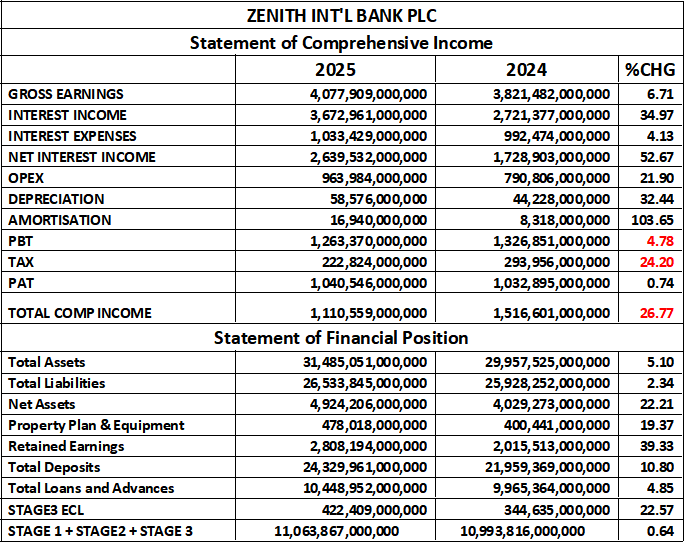Zenith Bank’s 2025 performance is underpinned by strong core revenue growth, particularly from interest-earning assets, as interest income rose significantly, driving a 52.67% increase in net interest income. However, this strong momentum was partly moderated by elevated impairment charges on financial instruments, reflecting a more cautious credit environment and possible deterioration in asset quality. While non-interest income lines, such as fees and commissions remained supportive, volatility in trading income and other operating lines suggests that earnings quality was largely anchored on core lending activities rather than diversified income streams.