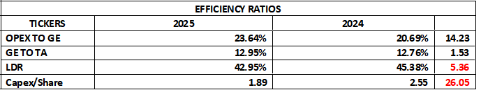 Liquidity and asset conversion efficiency showed some moderation, as the loan-to-deposit ratio (LDR) declined from 45.38% to 42.95%, suggesting a more conservative lending stance relative to deposit growth. While this enhances liquidity and reduces risk exposure, it may also indicate under-utilization of available funding for income generation. Additionally, capex per share declined significantly from 2.55 to 1.89, reflecting either a reduced capital expenditure intensity, or the effect of an expanded share base. Overall, the bank demonstrated a stable asset efficiency, but weakening cost efficiency and more cautious lending posture.