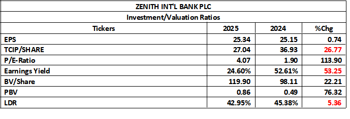 Overall, Zenith Bank presents a mixed but improving investment profile, characterized by strong equity growth and a notable upward re-rating in valuation multiples, albeit declining income yield and weaker comprehensive income performance. The moderation in the loan-to-deposit ratio (LDR) to 42.95% further supports a conservative risk posture, which may appeal to risk-averse investors. In summary, the bank appears to be transitioning from deep undervaluation towards fairer valuation levels, supported by fundamentals, but with reduced immediate yield attractiveness.
