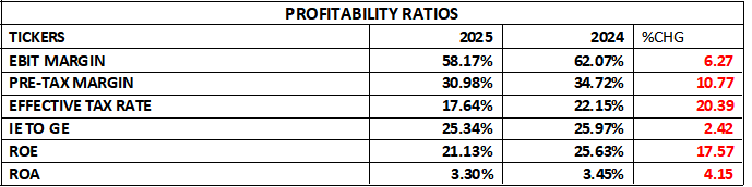However, returns weakened across key shareholder value metrics, with return on equity (ROE) declining from 25.63% to 21.13% and return on assets (ROA) easing from 3.45% to 3.30%. The drop in ROE is particularly notable, reflecting both reduced profitability margins and an expanded equity base following strong retained earnings growth. Overall, the bank delivered resilient but softer profitability, characterized by strong core income generation offset by rising costs, leading to reduced efficiency and lower returns.