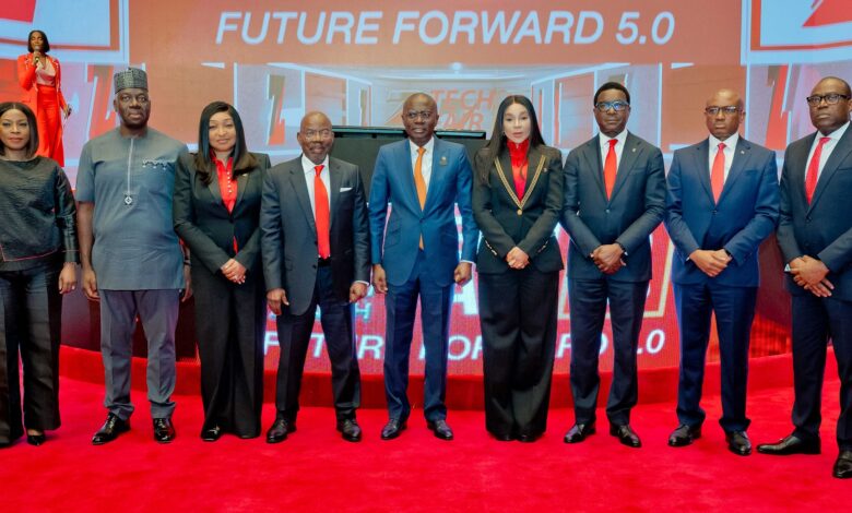 Caption: From left, Executive Vice President, CNN International Commercial, Phil Nelson; Founder & CEO, Beyond Limits Africa and Non-Executive Director, Zenith Bank, Dr. Juliet Ehimuan; Managing Director/CEO, NIBSS, Premier Oiwoh; Executive Director, Zenith Bank, Mrs. Adobi Nwapa; Founder & Chairman, Zenith Bank, Jim Ovia; Governor of Lagos State, Babajide Sanwo-Olu; Group Managing Director/CEO, Zenith Bank, Dame Dr. Adaora Umeoji; other Executive Directors of the bank, Akin Ogunranti, Louis Odom, and Adamu Lawani; as well as Director, Information Technology Infrastructure Solutions, NITDA, Oladejo Olawumi during the Zenith Bank Tech Fair Future Forward 5.0 held at the Eko Convention Centre, Eko Hotels & Suites, Victoria Island, Lagos, recently.